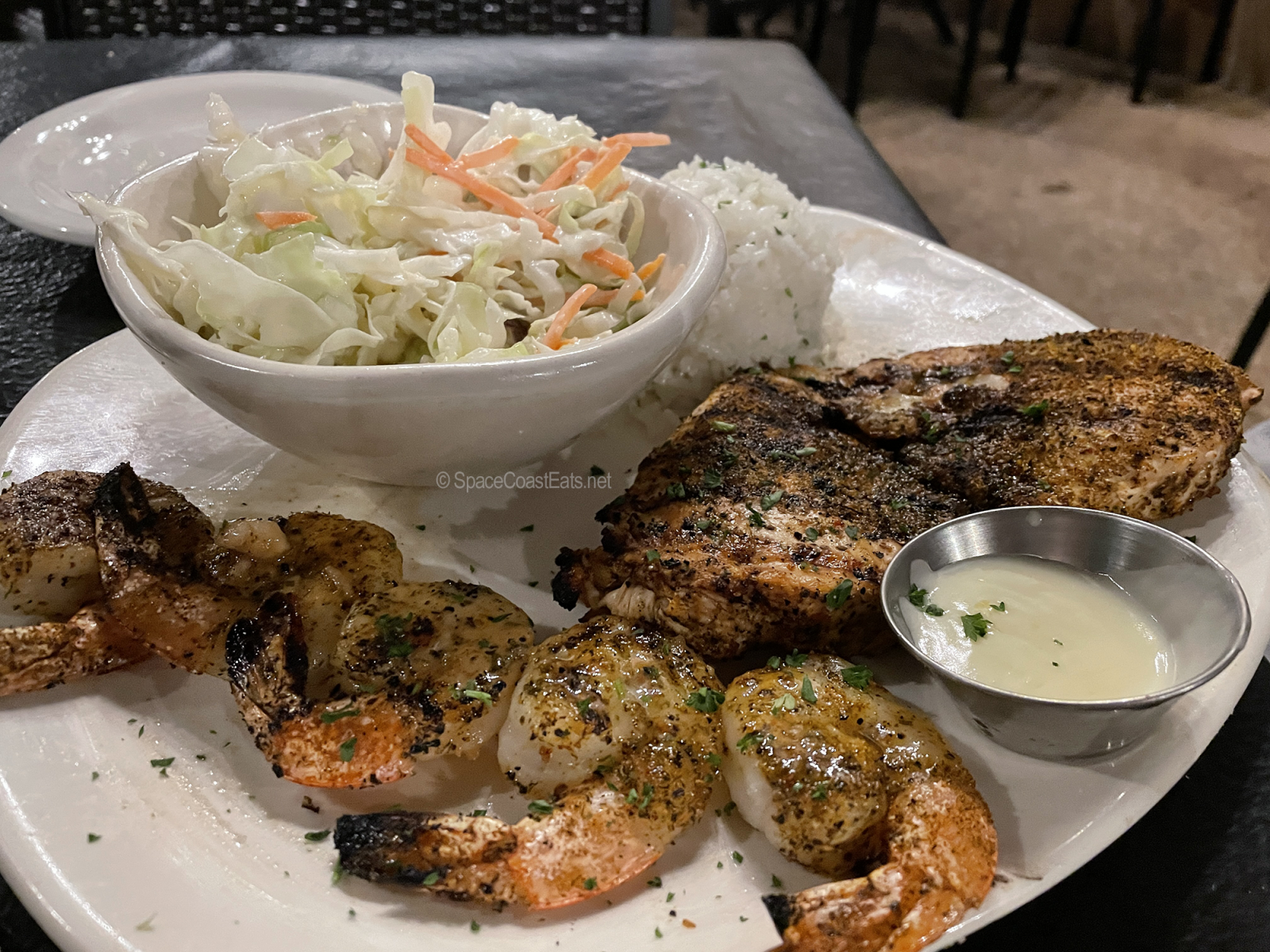 The first entree we have here is the chicken and shrimp combo. It’s a grilled chicken breast paired with jumbo shrimp that are brushed with citrus-herb marinade. This dish is served with two sides. Pictured here are coleslaw and jasmine rice.