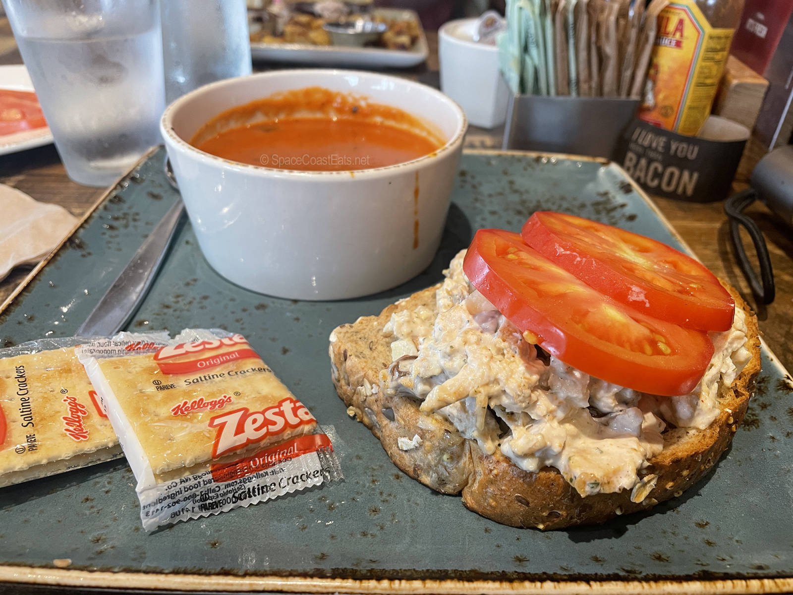 First up, we have the chicken salad melt without the melt. This open-face sandwich has all white meat chicken salad packed with apples, raisins, and celery and two big slices of tomato and served on multigrain bread. It comes with tomato soup.