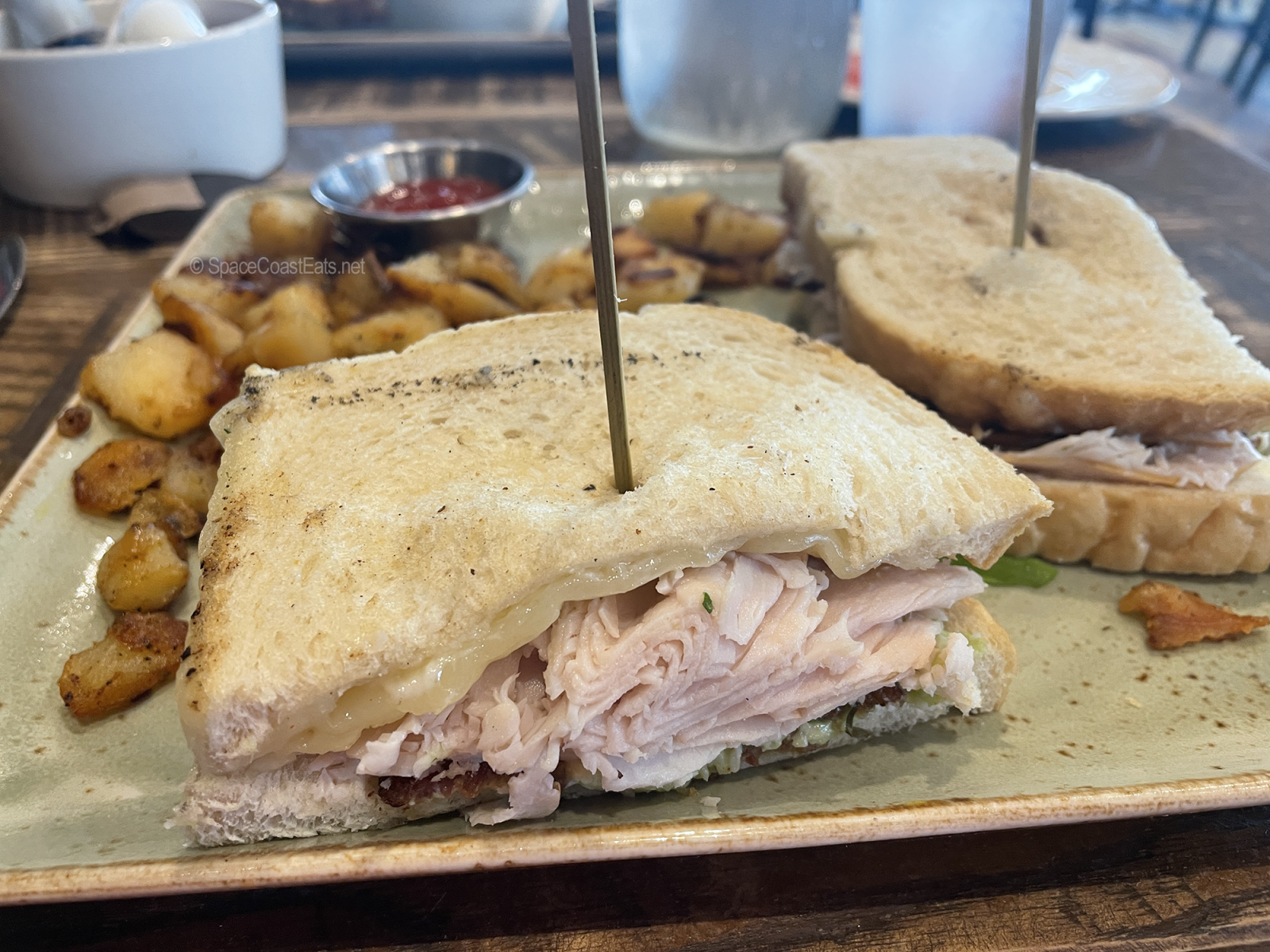 This a monterey club. It includes turkey, bacon, avocado, organic mixed greens, mayo, monterey jack cheese, and tomato served on sourdough bread. It comes with mixed greens on the side but we substituted it with fresh, seasoned potatoes. This one has no tomato or mixed greens.