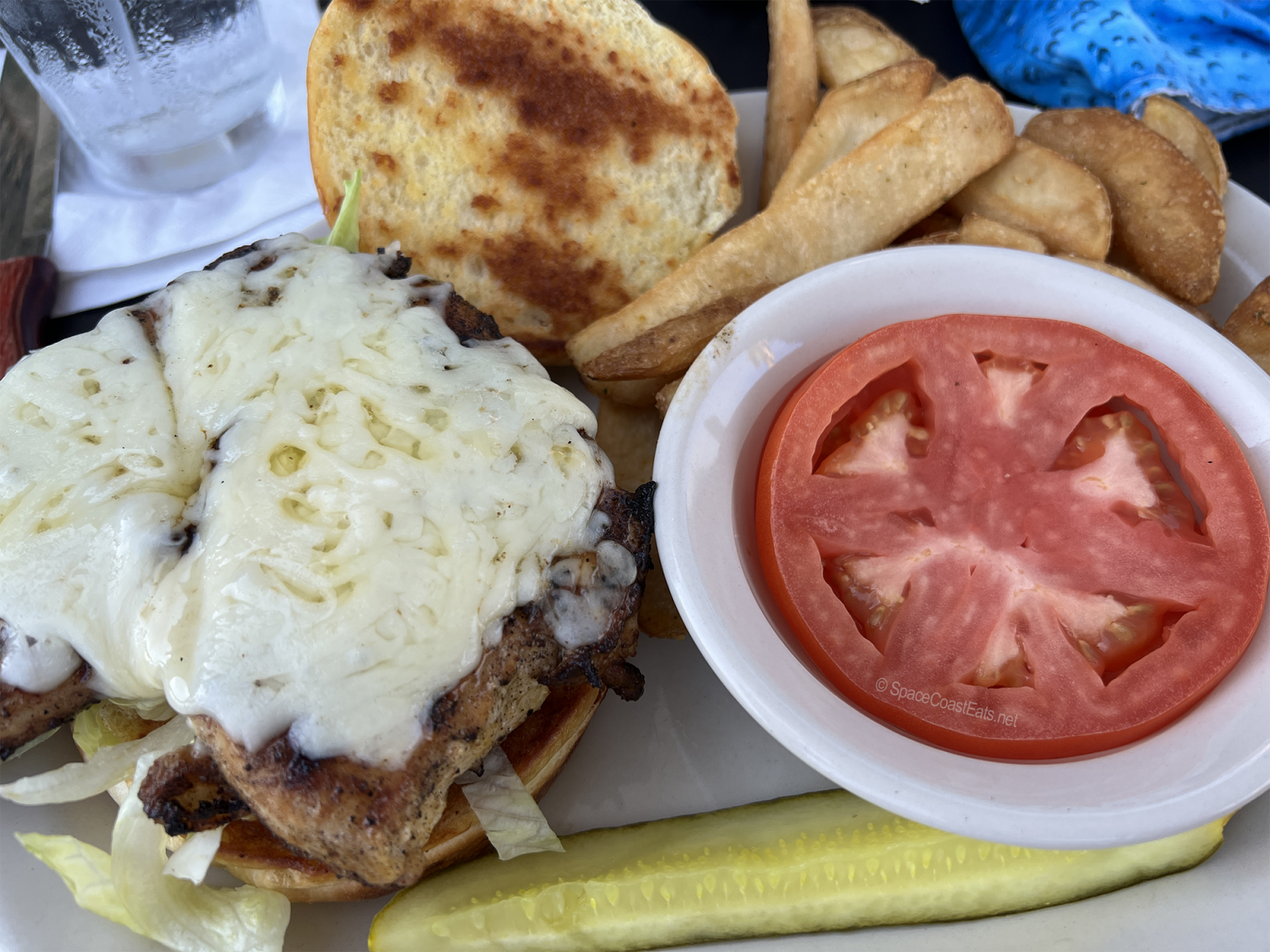 This is the mushroom jack chicken sandwich without the mushrooms. It comes with lettuce, tomato, and onion. Here the tomato is on the side and the onion was axed. They’re jack cheese melted on top of the chicken. Served with steak fries.